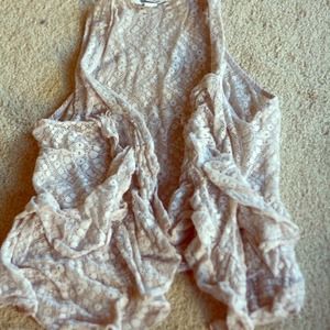 Light pinkish/tan frilly lace/crochet patten vest. Nice length, very cute with a sundress!