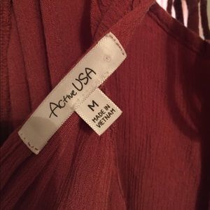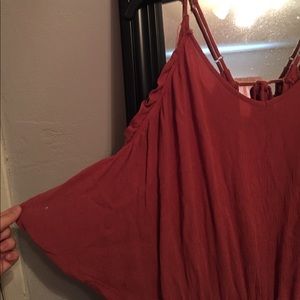 Beautiful rust colored romper! Has open shoulders, frilly sleeves/bottoms, and an open back with an adjustable tie! If you have any questions comment below :)