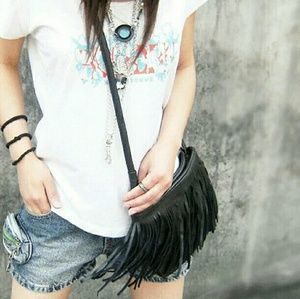 Adorable Fringe faux leather bag with long shoulder strap. Perfect casual fall bag. Has zipper closure and interior cell phone pocket.