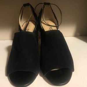 4 inch black fringe beaded heel by Katy Perry. Previously loved & worn once. Suede peep toe w/ankle strap. Great fun shoe!