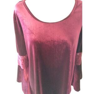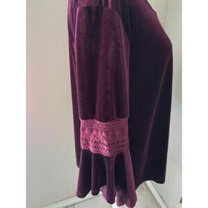Add a touch of bohemian charm to your wardrobe with this stunning Fringe Benefits top. Made from a luxurious polyester blend, this blouse features a round neckline, wide straps, and 3/4 bell sleeves for a look that's both elegant and effortless. The maroon velvet fabric is accented with contrasting trim and crochet details, adding a touch of witchy, hippie, bohemian, and fairy flair to your outfit. Whether you're dressing up for a party or casual event, or simply looking for a comfortable yet stylish option for travel or business, this blouse is the perfect addition to your collection. Hand wash only to keep it looking its best. Pit to Pit measures 22", length 25.
