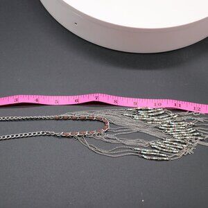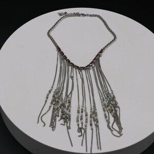 In very nice condition, BOHO style fringe bib necklace in siver tone. It has a 15" necklace with an overall length of approximately 14".
