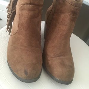 Cute brown fringe booties. Totally on trend! The bottom heel of on the booties fell off. Can easily be taken to a shoe repair to add one back on, I just don't have the time! :) i still wore them without it ;)