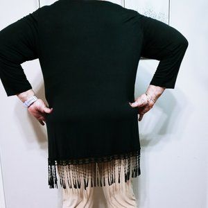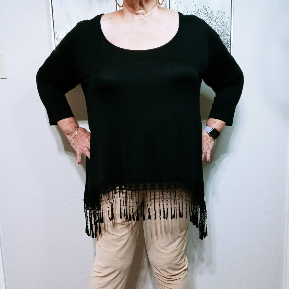 Looking for a "fun" tunic length top. This barely worn, one of a kind,fringe bottom top never fails to show your fun flirty side. Dress it up or down you decide. Pit to pit 26".