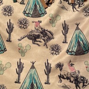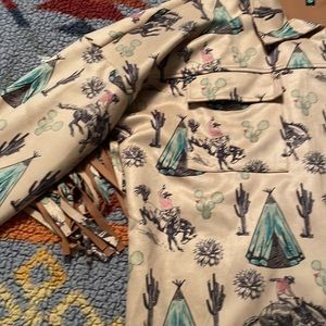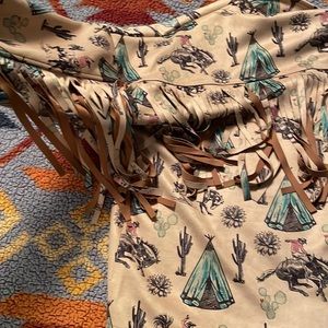 NWOT. Full fringe back suede-style jacket with the coolest bucking horse and teepee design. I ADORE this jacket but it is too big after my recent weight loss, sadly. This is perfect for a rodeo, concert, anything, really.