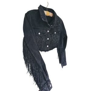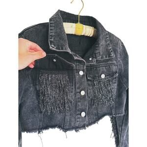 Step out in style with this edgy, cropped denim jacket! This black denim jacket features a raw, frayed hem and trendy tassel accents, giving it a unique, distressed look. The button-down front adds a classic touch, while the cropped fit keeps it modern and flattering.