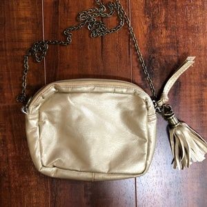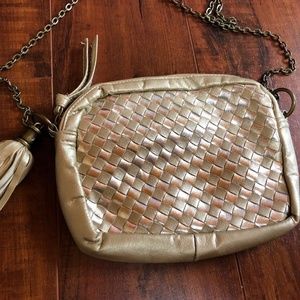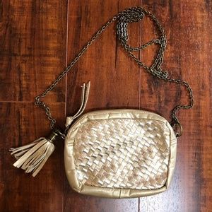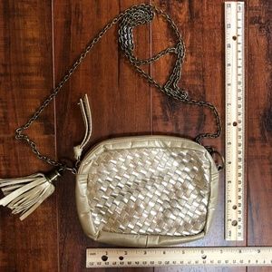 Metallic Gold Faux Leather SM Woven Fringe Cross Body Chain Messenger Purse Bag