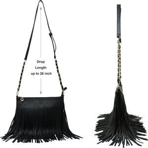 This stylish fringe shoulder bag has an attached adjustable shoulder strap drop up to 26" and high quality gold tone hardware. Product actual usable size is 10" x 7" x 1". When cleaning the bag, it is recommended to moisten a soft non-abrasive cloth with warm water and wipe over.