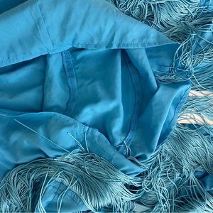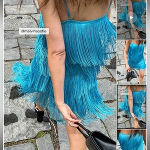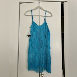 This mini dress is sleeveless and features fringes along the item and adjustable shoulder straps.