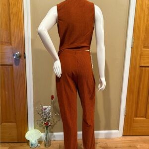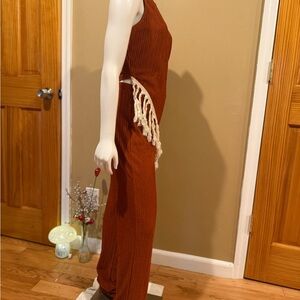 Elevate your style with this chic rust jumpsuit featuring elegant fringe details. Perfect for any occasion.