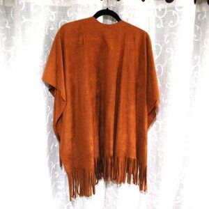 This is a faux suede throw on/shawl for the bold. You don't have to live out West with this one, wear anywhere. One size, brown with lots of fringe!