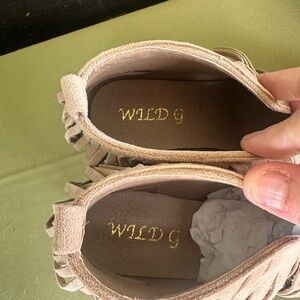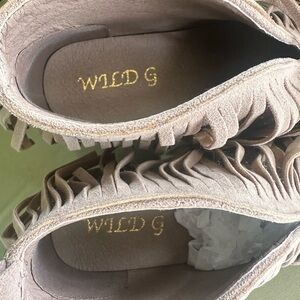 Step out in style with these chic ankle boots featuring a dazzling silver glitter finish and playful tan fringe. Perfect for adding a touch of glamour to any outfit.