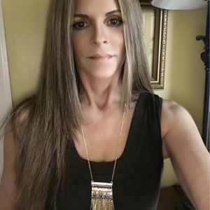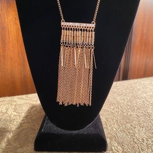 This is a costume jewelry gold chain that features a fringe and gold drop detail combined with crystals and rhinestones. Has a 16" drop in length and lobster clasp. Man made material, imported. New, in excellent condition.