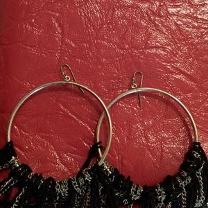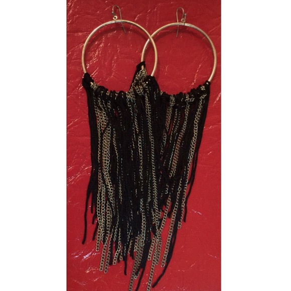 Subtle tarnished distress on the hoop metal . // Dangling chains and thread fringe . // 7” - 7.25” Long