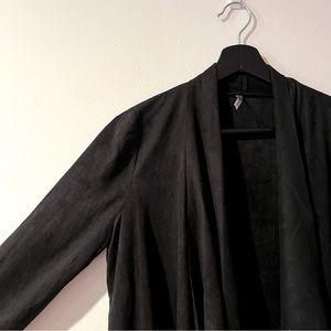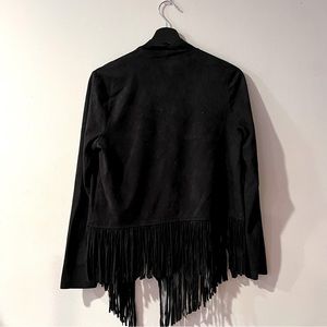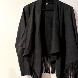 Women’s black long-sleeved fringe jacket, suede-like material. Somewhat cropped, in great condition!