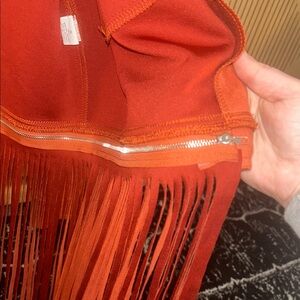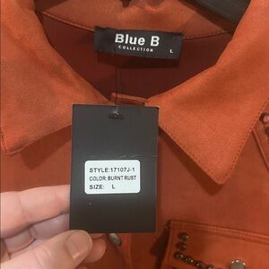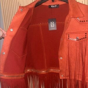 New with tags Blue B, size large, burnt rust jacket. Very soft and stretchy, suede like material. The bottom layer of fringe will zip on/off