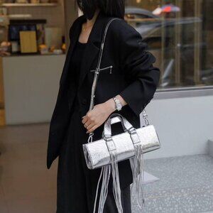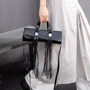 Dare to stand out with **Fringe Muse** — an avant-garde handbag crafted from **high-quality genuine leather**, designed to turn every sidewalk into a runway. The sleek cylindrical silhouette is accentuated by **dramatic leather fringe** that moves gracefully with every step you take.