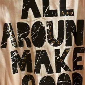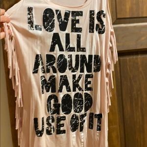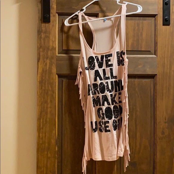 Racer back, light pink. Bold print with stud detail. Fringe down sides. “Love is all around make good use of it”