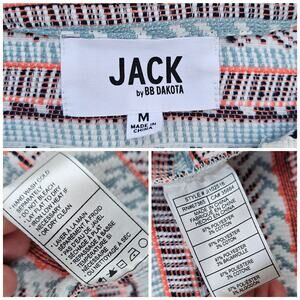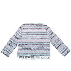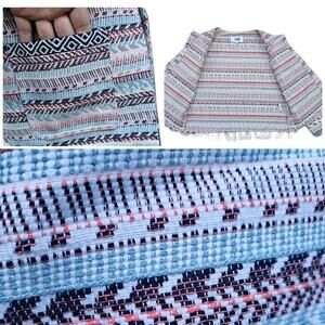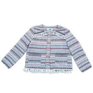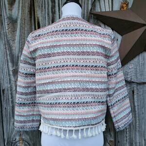Woven embroidered fabric in shades of blue & white w/ coral accents. Open front, cropped length sleeves, 2 front pockets, unlined, cute off white tasseled fringe trim. Excellent preowned condition. Size Medium by BB Dakota Jack line.