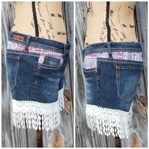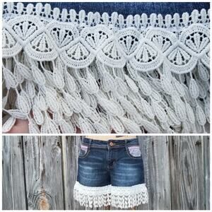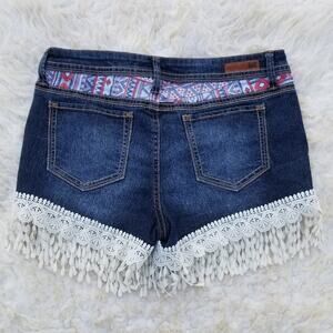 Fringe Trim Shorts Stretch Denim LEI Low Rise Ashley Size 9 Lace Crochet Boho