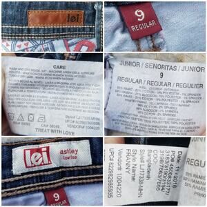 Dark wash stretch denim w/ factory fading, sanding, whiskering. 5 pocket, button/zipper fly, lower rise. Embellished w/ tribal western pattern fabric accents, crocheted lace teardrop chandelier fringe on hems. Excellent preowned condition. Size 9 by LEI. Style: Franny Ashley Low Rise. Festival Concert Summer Spring Break Staple
