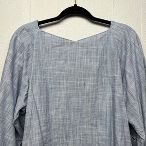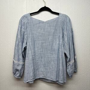 Womens pinstriped top in blue & white. Round neck. Long puff sleeves. Semi-cropped length. Fringe and cut out details. Lightweight. In good used condition. No stains, tears or holes.