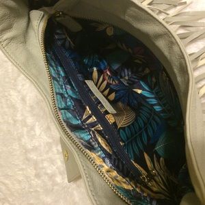 Grey shoulder purse with fringe. Gold chain and gold studs for a little pop! Cute floral lining inside with a zipper pocket. Some fringe is falling apart but can go unnoticed!