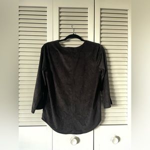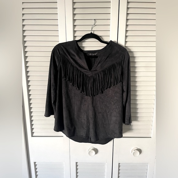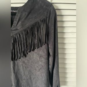 Fringe, three-quarter length velour top. Never been worn, this top is a cool black-blue color and is a fun addition to anyone’s closet!
