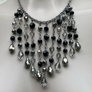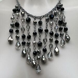 Fringe Rhinestones Choker Statement Necklace Black & Silver Crystals Silver Tone Chain