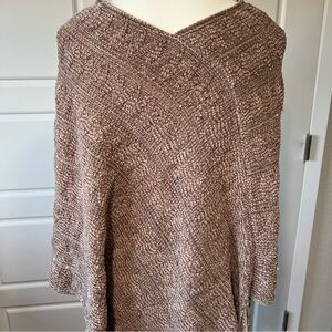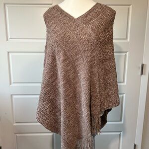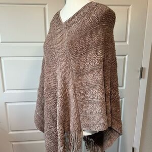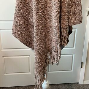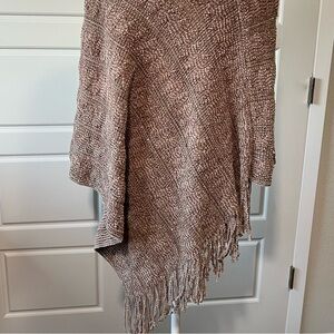 Keywords: poncho, cape, shawl, sweater, pullover, chenille, fringe, bohemian, boho, v-neck, brown poncho, beige poncho, fall fashion, winter fashion