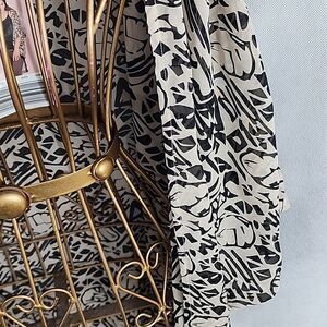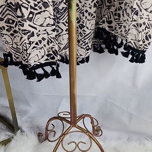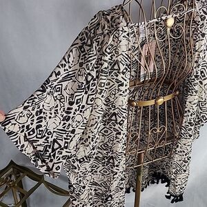 one Size fits most, black and tan geo and leaf patterned kimono with fringe. Wear as shown, with a tank top or tee, or use as a swimsuit cover~up. Versatile and easy to pack
