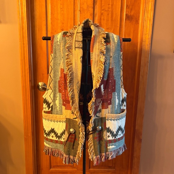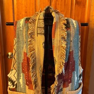 Elevate your style with this fringed multicolor vest. Perfect for layering, this vest features a blend of earthy tones for a chic look. No size on tag but fits Med/Large oversized