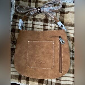 Stylish tan suede shoulder bag with fringe and studded details. NWT