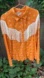 Orange western shirt with white horseshoe design. Fringe accents add flair. Seven front and four pearlescent snap buttons with metallic silver-toned rims on each sleeve.