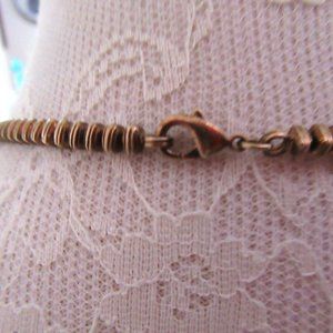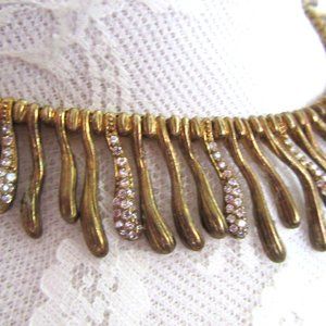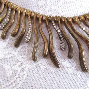 Interesting necklace measures 16" and closes with a lobster clasp. Brass has developed a nice dark patina and all rhinestones are intact. Nice statement piece!
