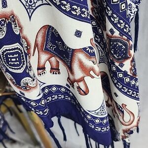 Cobalt Blue, rust and mauve on a cream background. Elephants are parading all throughout the pattern. Fringed around arm holes and bottom at hem. Vines and florals add to this pretty lightweight kimono~wrap. Great for travel!
