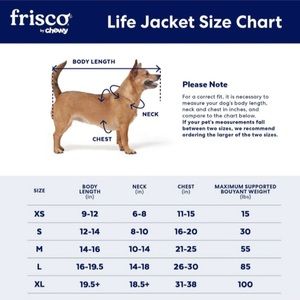 To find the right jacket for your pup, measure their chest, neck and weight. Then, compare their measurements to the size chart and the Maximum Buoyant Weight listed.