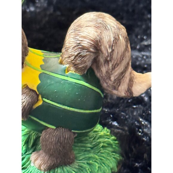 This intricately crafted resin figurine depicts a raccoon dressed as a squash, embodying the spirit of autumn.