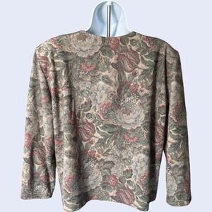 Vintage floral tapestry jacket in earthy multicolor tones with a boxy, collarless silhouette and curved front hem. Medium-weight jacquard knit (74% polyester, 26% rayon) with a soft, textured hand. Late-80s/90s vibe; full floral pattern; square gold pyramid buttons; made in USA. Condition: Good.