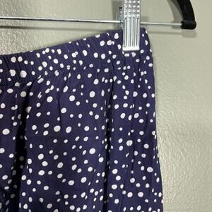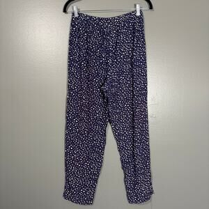 Woman's vintage pull on lightweight pants by Fritzi California from the 1980's. These navy blue pants have an abstract polka dot pattern, elastic waist, and tapered legs. They are an acetate rayon blend and are made in the USA.