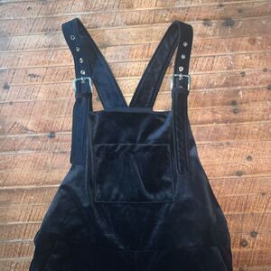 FRNCH black velvet, bib overalls. Silver hardware. Adjustable straps. Approximately 17 inches across the waist, 11 inch rise, 28 inch inseam, and 57 inches long. Side zipper. In good, gently used condition. From a pet and smoke free house. Happy to bundle!