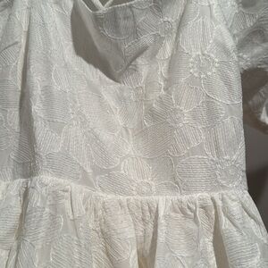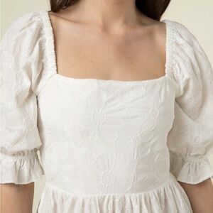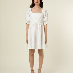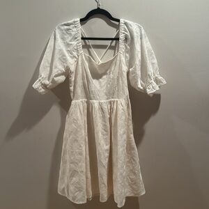 This stunning white sundress by FRNCH features a captivating backless design with delicate criss-cross straps, perfect for a party guest or cocktail event. The puff sleeves and gathered waist enhance its feminine silhouette, while the flowy A-line skirt adds a touch of elegance. Great condition, 15” ptp, 36” length