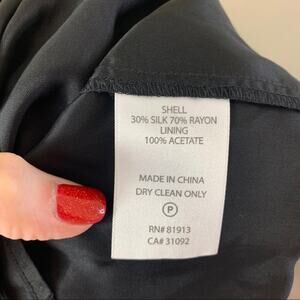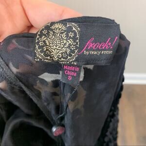 Size S. 30% Silk 70% Rayon. Length shoulder to hem 35 1/2 inches. Armpit to armpit 17 inches. Top layer is sheer with velvet animal print. Ties in the back. Flowy. Great condition!