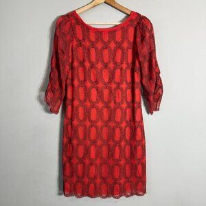 The Frock! by Tracy Reese Silk Backless Mini Dress is a stunning piece with a geometric pattern in red and black, featuring embroidered accents and a chiffon fabric. This dress has a round neckline, half sleeves with puff sleeves, and a zip closure. It is perfect for various occasions such as formal events, weddings, parties, and more. The lightweight silk material and slimming fit make it suitable for all seasons, while the backless design adds a touch of elegance. Made by the reputable brand Tracy Reese, this dress is a stylish and chic choice for any woman's wardrobe.