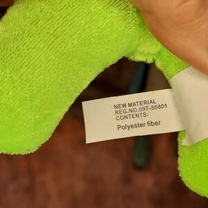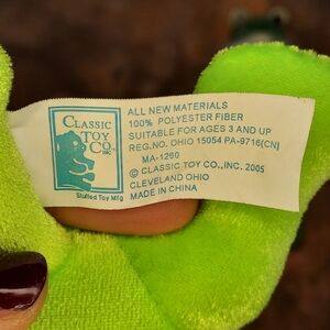 1. Small plush frog from Classic Toy Co. Polyester fiber with velvety/velour feel. Approx 5.5" x 4"