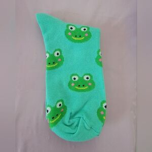 Cute green socks with frog pattern. Perfect for adding a fun touch to your outfit.