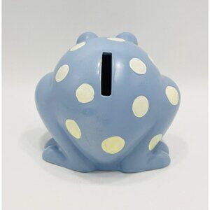 This adorable ceramic piggy bank in the shape of a frog is a must-have for any animal-themed nursery. The bank features a frog in pastel colors, light blue with yellow spots, and comes with its original stopper. This toad bank measures 4 inches in height, 5 inches in length and 4.5 inches in width. Made by Enesco in China, this collectible item is perfect for storing spare change and teaching children about the value of saving money.