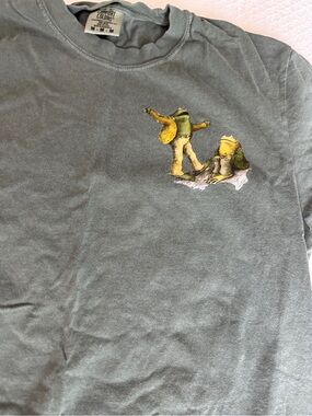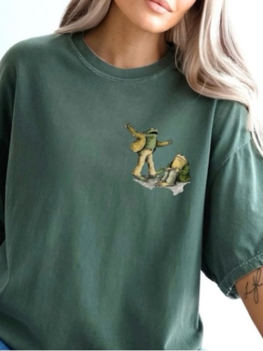 Soft moss green short-sleeve tee with a small Frog & Toad characters.