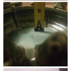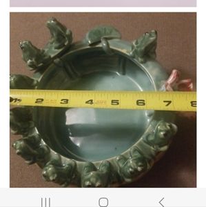 10 little Majolica Frogs sitting on a bonsai planter..vintage..like new condition