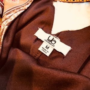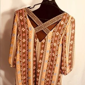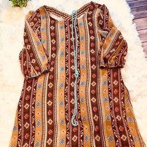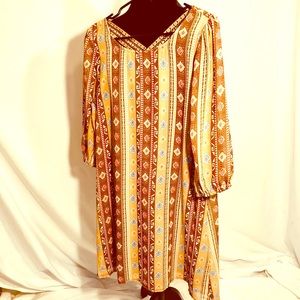 Pair this dress with boots and you have in instant fashion win. Great warm colors, back has a criss cross embroidered ribbon feature, dress is fully lined and fabric is a silk /poly mix.